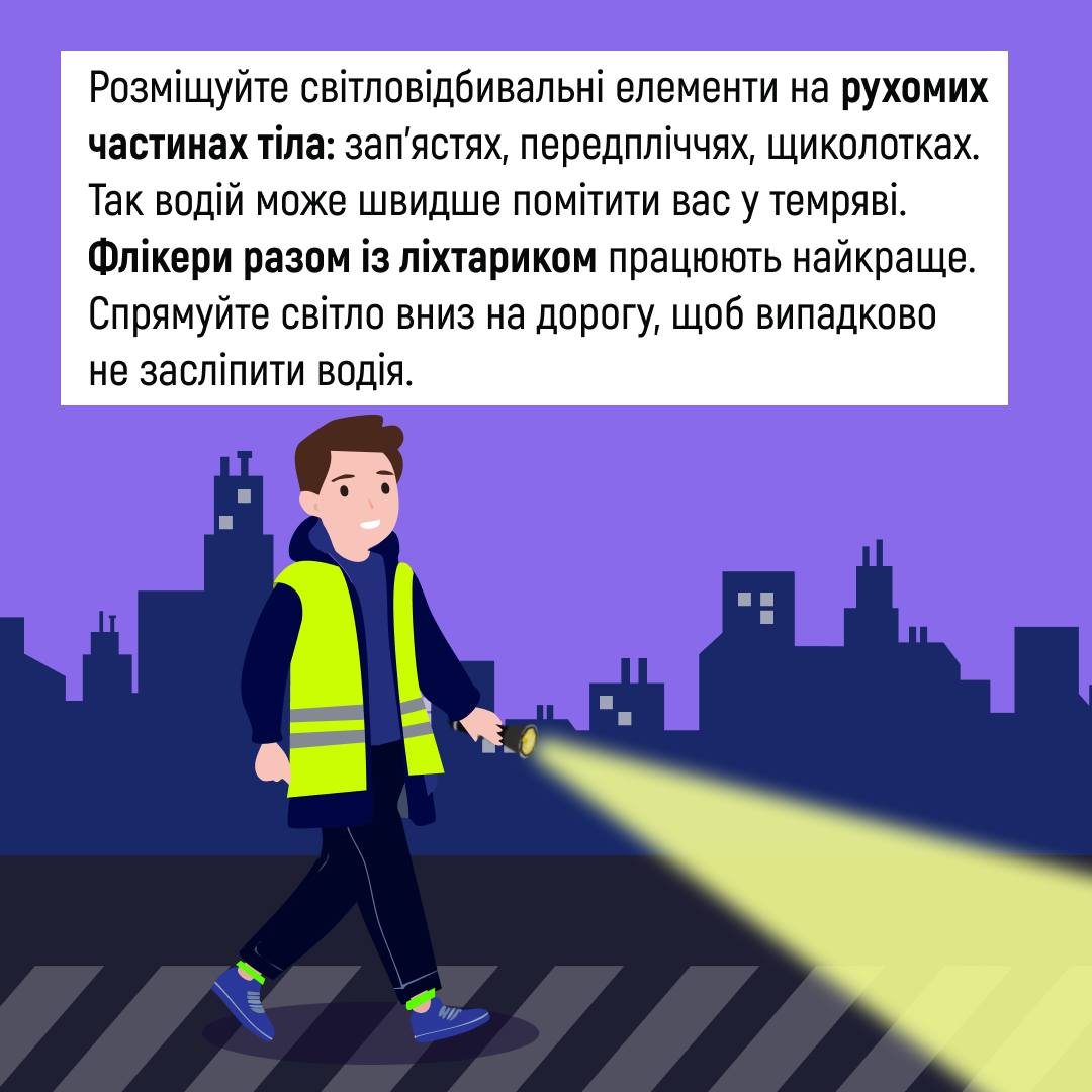 Тож з метою запобігання нещасних випадків прикарпатські поліцейські рекомендують пішоходам та велосипедистам використовувати світловідбиваючі елементи на одязі, так звані флікери — маленькі значки або наклейки, які відбивають світло в темряві. Вони допомагають водіям побачити пішохода або велосипедиста у нічний час.